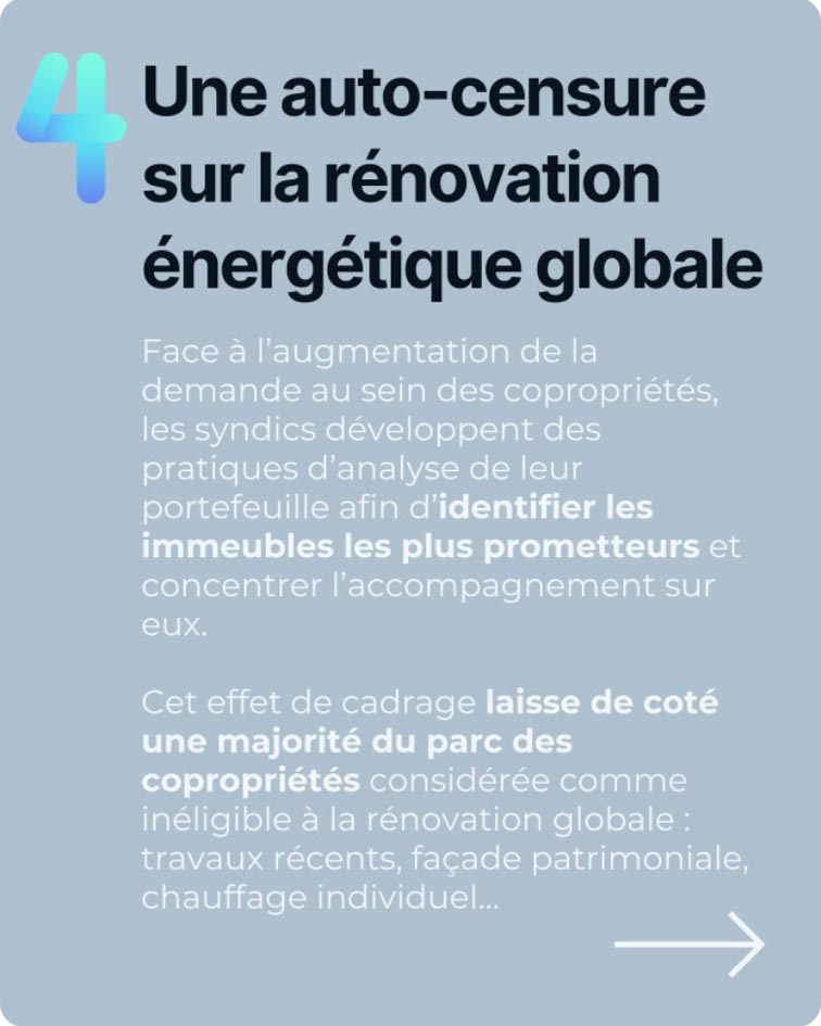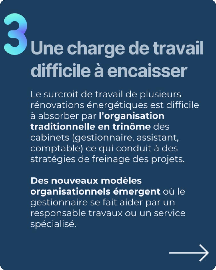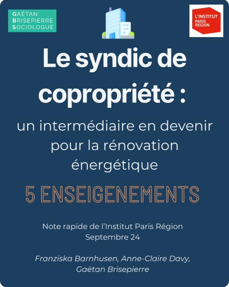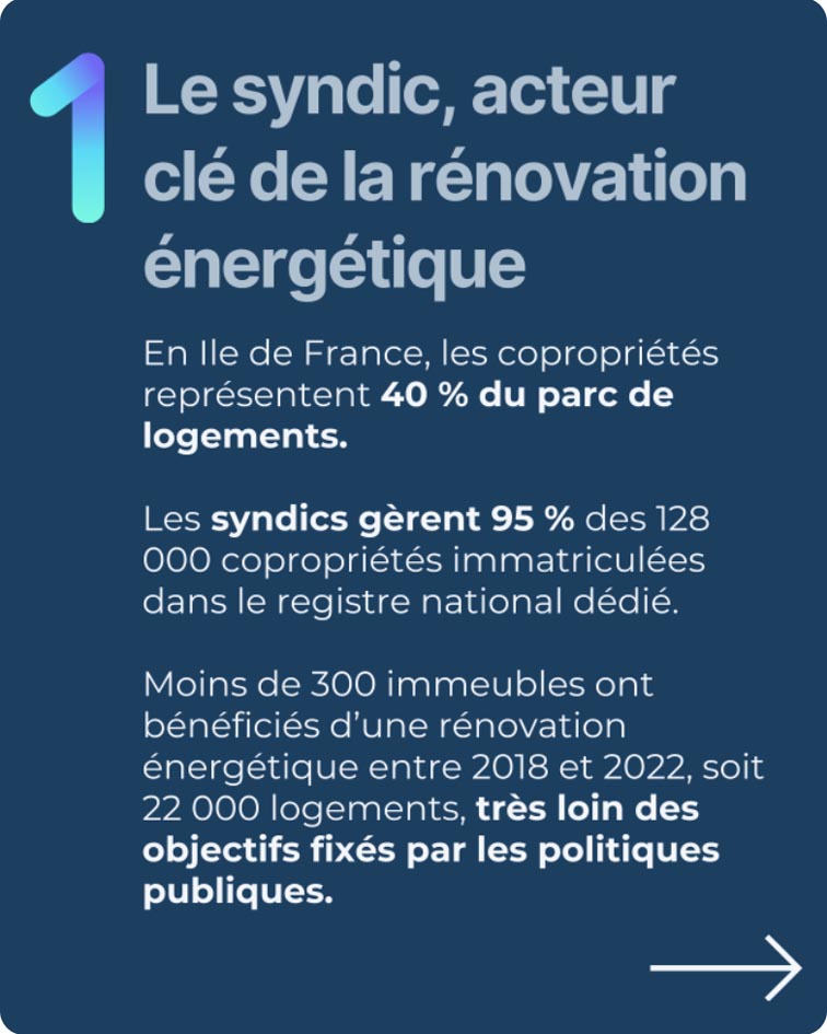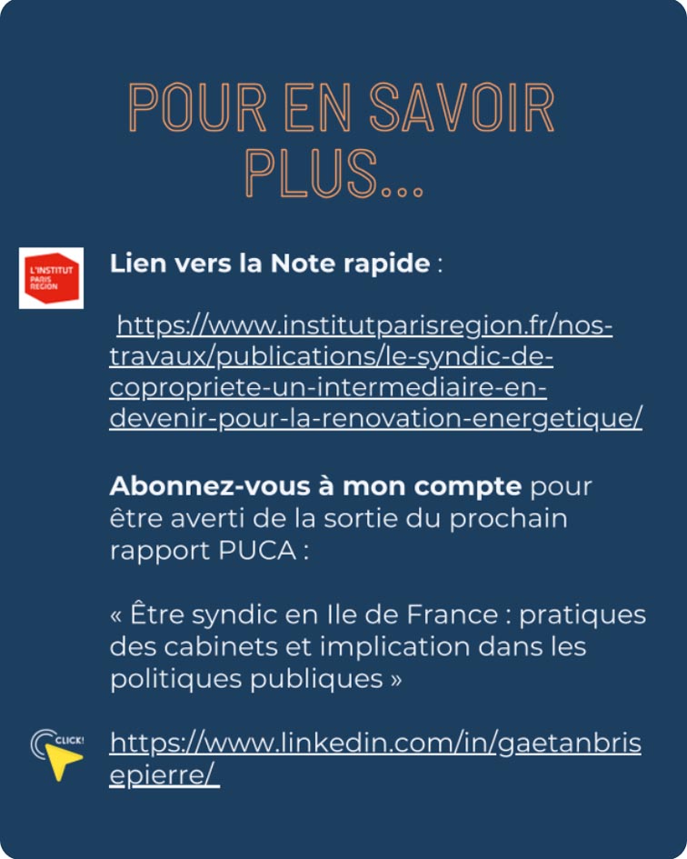 « La stratégie de stimulation de la demande de travaux se heurte aujourd’hui à l’immaturité de l’offre, qui ne semble pas suffisamment développée – ni en quantité ni en qualité – pour y répondre. Les syndics sont tributaires de la disponibilité d’une offre de rénovation énergétique, nécessitant des assistants de maîtrise d’ouvrage, maîtres d’œuvre et entreprises de travaux compétents pour intervenir en copropriété. Les syndics franciliens sont nombreux à souligner la difficulté à mobiliser des entreprises qualifiées pour les projets de travaux. Le manque de professionnels dans le secteur de la rénovation énergétique est un constat largement partagé : […] Ils [les syndics] ont ainsi besoin d’être entourés d’acteurs de confiance, en mesure d’accompagner les projets. Pour faire face aux enjeux de la rénovation, le principal défi réside dans la montée en puissance rapide et concomitante de l’ensemble de ce système d’acteurs. Alors qu’en Île-de-France la demande des copropriétaires pour la rénovation énergétique semble de plus en plus mature mais que l’offre est lacunaire, les syndics apparaissent comme des intermédiaires essentiels dans la structuration de ce marché. Plus que de simples intermédiaires, ils peuvent exercer une fonction de régulateur, en assurant l’allocation optimale de ressources rares de l’offre vis-à-vis d’une demande difficile à qualifier, tant les copropriétés présentent des caractéristiques variées ».